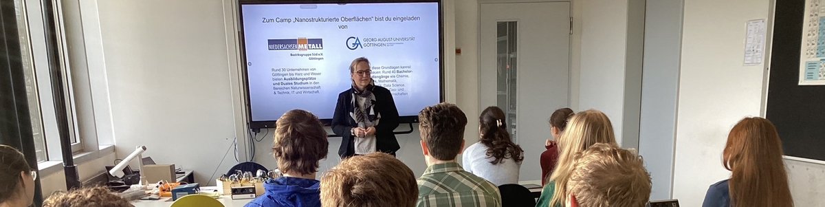 Am Beispiel des Werkstoffs Titan und darauf erzeugtem nanostrukturiertem Titandioxid haben die Teilnehmenden des MINT-EC Science Camps "Nanostrukturierte Oberflächen" an vier Tagen selbst experimentell erlebt, wie sich durch Oberflächenmodifikationen ansprechende optische Effekte und funktionale Eigenschaften erzielen lassen. Auf elektrochemische Weise nanostrukturiertes Titandioxid wurde so zum Bau neuartiger Solarzellen, Gassensoren ("Alkoholtester") und Natrium-Ionen-Akkus eingesetzt. Neben diesem praktischen Teil im Labor und der Charakterisierung des Materials am Rasterelektronenmikroskop wurde das Camp durch Beiträge von Niedersachsenmetall, Bezirksgruppe Süd e. V. bereichert und abgerundet. Dinah Stollwerck-Bauer, Hauptgeschäftsführerin des Arbeitgeberverbands Mitte e. V., hat dabei den Teilnehmenden einen Einblick in die Attraktivität der Arbeitgeber der Metallindustrie vermittelt, bevor es in einem interessanten Gespräch mit Vertreter*innen der Piller Group aus Osterode und der Göttinger Sartorius AG dann um konkrete Berufsperspektiven und Möglichkeiten zum dualen Studium ging. Ganz herzlichen Dank an Niedersachsenmetall und seine Mitgliedsunternehmen auch für die finanzielle Unterstützung, die dieses Science Camp auch im Jahr 2025 wieder möglich gemacht haben.